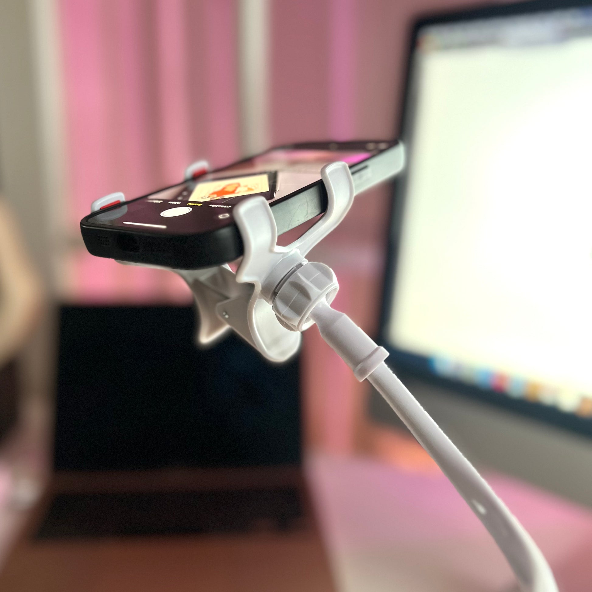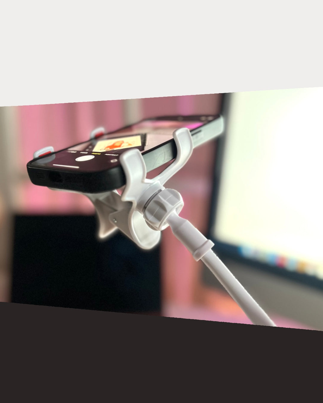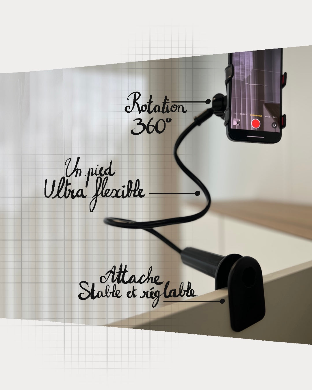 Son pied souple et ultra-résistante s’accroche partout en quelques secondes grâce à son attache réglable et resserable : autour d’une table pour tourner un tuto, sur un guidon pour un vlog dynamique, ou directement fixé sur une étagère au dessus d'un plan de travail pour filmer une petite recette! Résultat : ton téléphone reste solidement fixé, tu n’as plus à t’inquiéter ! Peu importe l’angle ou l’endroit, tu crées en toute liberté.