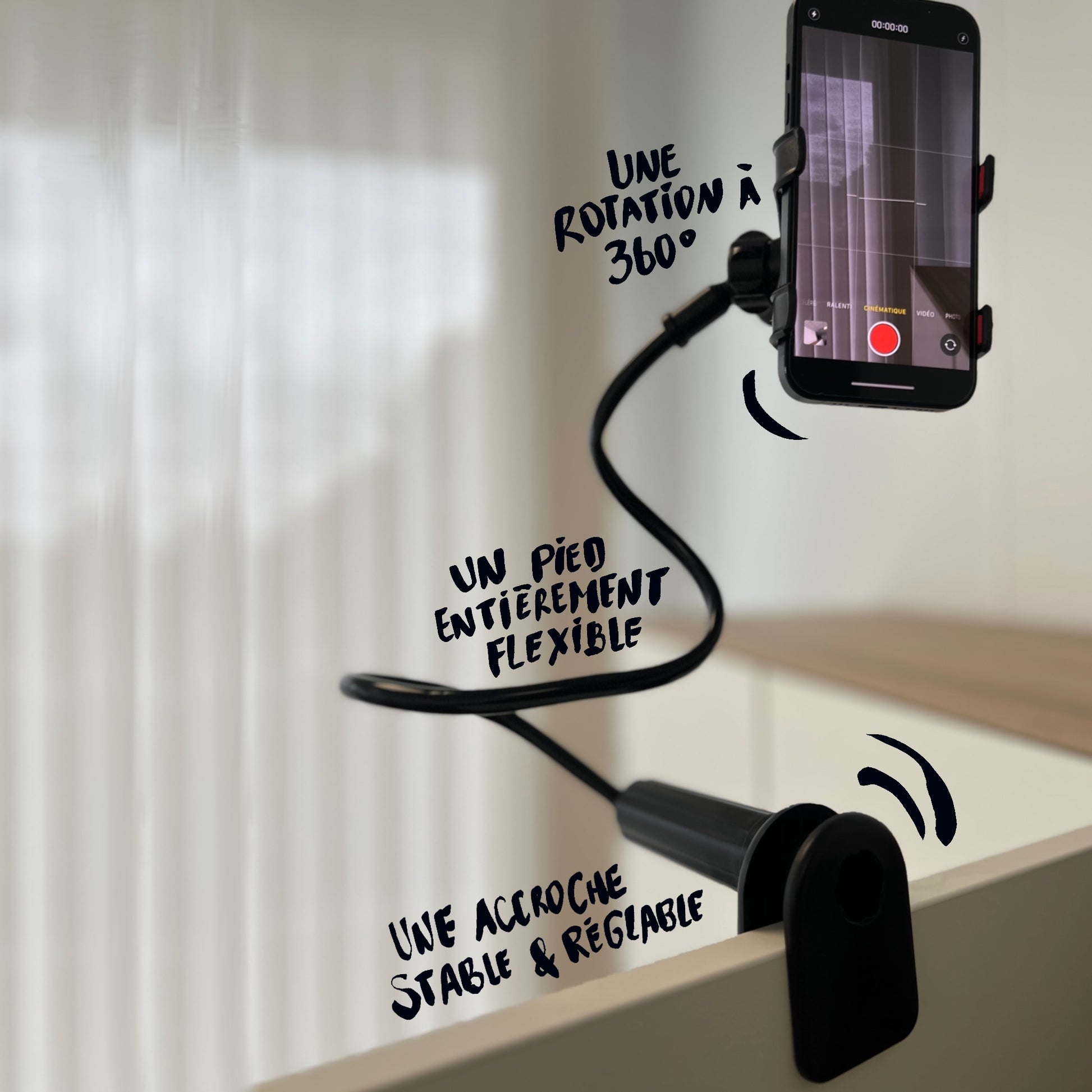 ✅ Pied flexible et solide – s’accroche partout (table, guidon, branche…) et s’adapte à tous les environnements.
