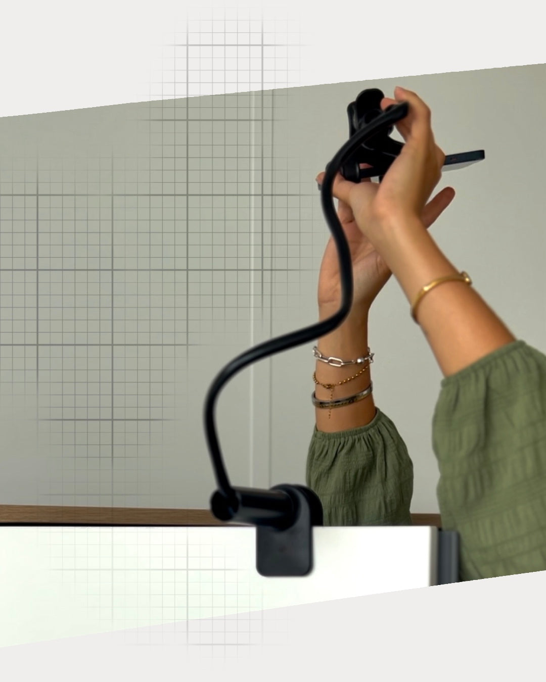 Son pied souple et ultra-résistante s’accroche partout en quelques secondes grâce à son attache réglable et resserable : autour d’une table pour tourner un tuto, sur un guidon pour un vlog dynamique, ou directement fixé sur une étagère au dessus d'un plan de travail pour filmer une petite recette! Résultat : ton téléphone reste solidement fixé, tu n’as plus à t’inquiéter ! Peu importe l’angle ou l’endroit, tu crées en toute liberté.